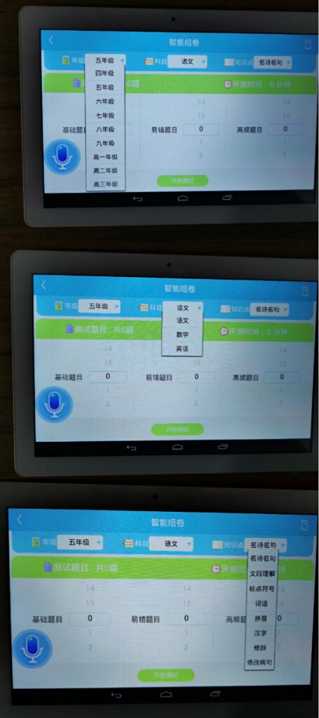 小霸王平板电脑的智能组卷部分是我最喜欢的一个地方,从小学一年级到高中三年级。从语文,数学,英语到生物,化学,历史,地理,政治全部包含。拿我们小学来说,语文可以从拼音,标点符号,生字词语一直考到古诗词。数学可以从最简单的加减乘除一直到图形面积负数。英语更是细致到每一种词性以及时态。你可以根据个人的薄弱环节重点训练。另外里面还包含了错题本,每一科的错题都会单独集中在一起,更方便你查漏补缺,攻克自己的薄弱点。