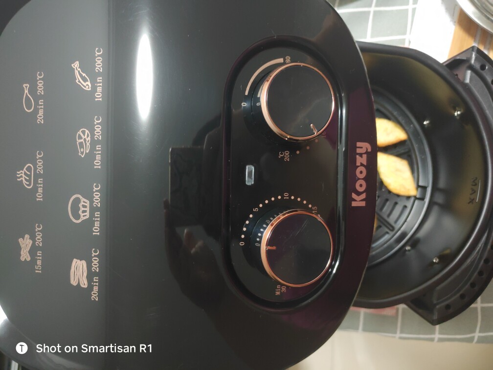 可滋宜空气炸锅控制时间的按钮有点像电扇的那种倒计时按钮,是不可逆的。调节温度的按钮在工作过程中可以比较顺滑的提高或者降低温度,而且很方便的一点是在机身上有图示,用来说明每一种食材在烹饪的时候需要设定的时间和温度。