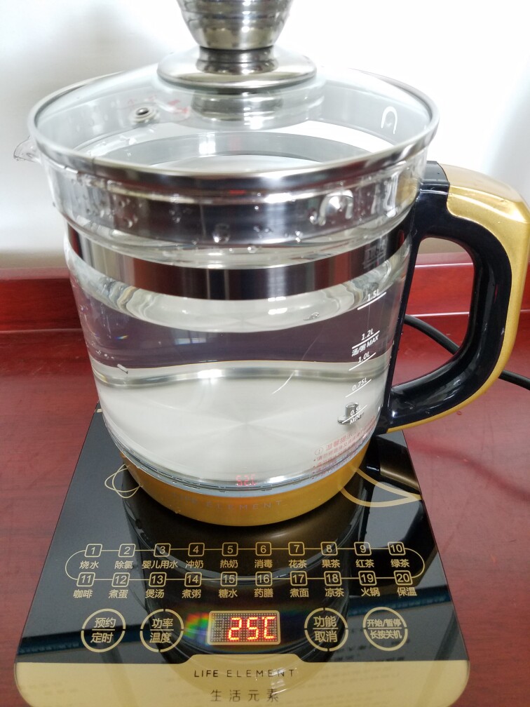加入清水,立马显示水温,现在水温25度,开始计时烧水。清澈透明,比我之前那个专用的不透明的烧水壶好看多了,看上去也高端大气上档次。
